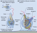 Aunque los urocordados adultos no tienen todos los rasgos típicos de los cordados, las larvas, de vida libre durante un tiempo muy corto, poseen esas características, en particular la presencia de notocorda en la cola. (a) La larva y (b) la forma adulta. En la larva, la túnica cubre la boca y el atrioporo, lo que evita el flujo de agua a través de la faringe y de sus hendiduras branquiales ciliadas. Así, incluso en las especies en las cuales la faringe larval está bien desarrollada, como se muestra aquí, la larva es incapaz de alimentarse. Después de una breve existencia libre, se asienta en el fondo y se fija por el extremo anterior. Entonces comienza la metamorfosis: desaparece la cola de la larva con la notocorda y el cordón nervioso dorsal y el cuerpo entero del animal presenta un giro de 180 grados. (c) Tunicados adultos actuales, llamados ascidias o papas de mar.